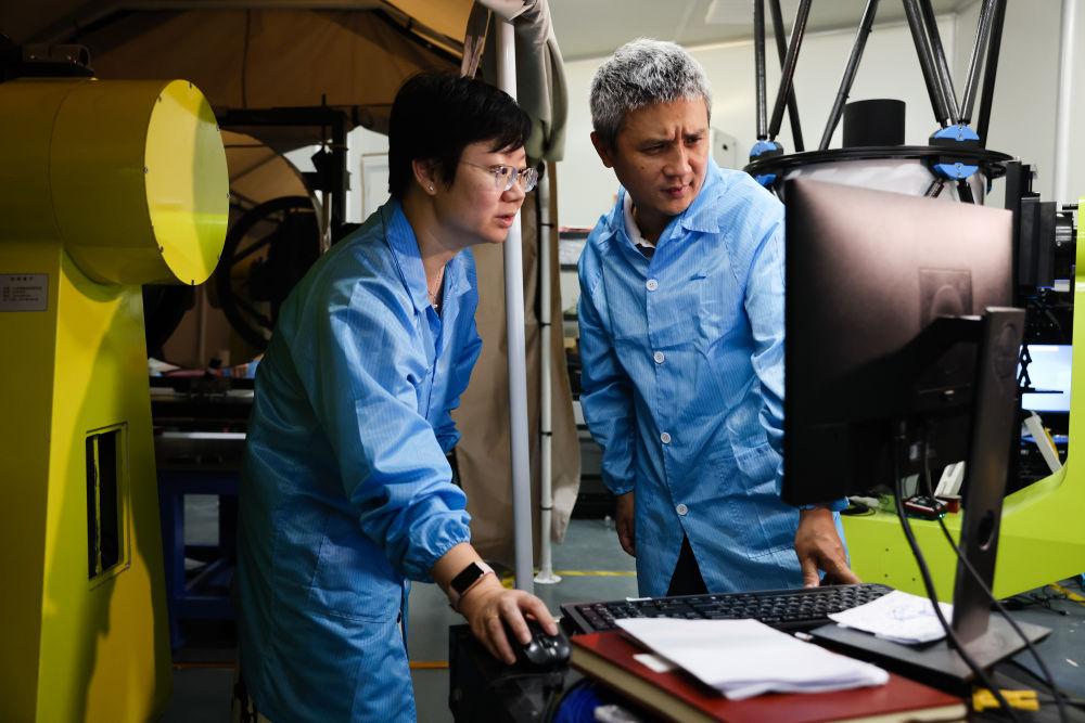 在中国科学技术大学上海研究院实验室,印娟(左)和同事在查看实验数据(2023年7月22日摄)。新华社记者 金立旺 摄