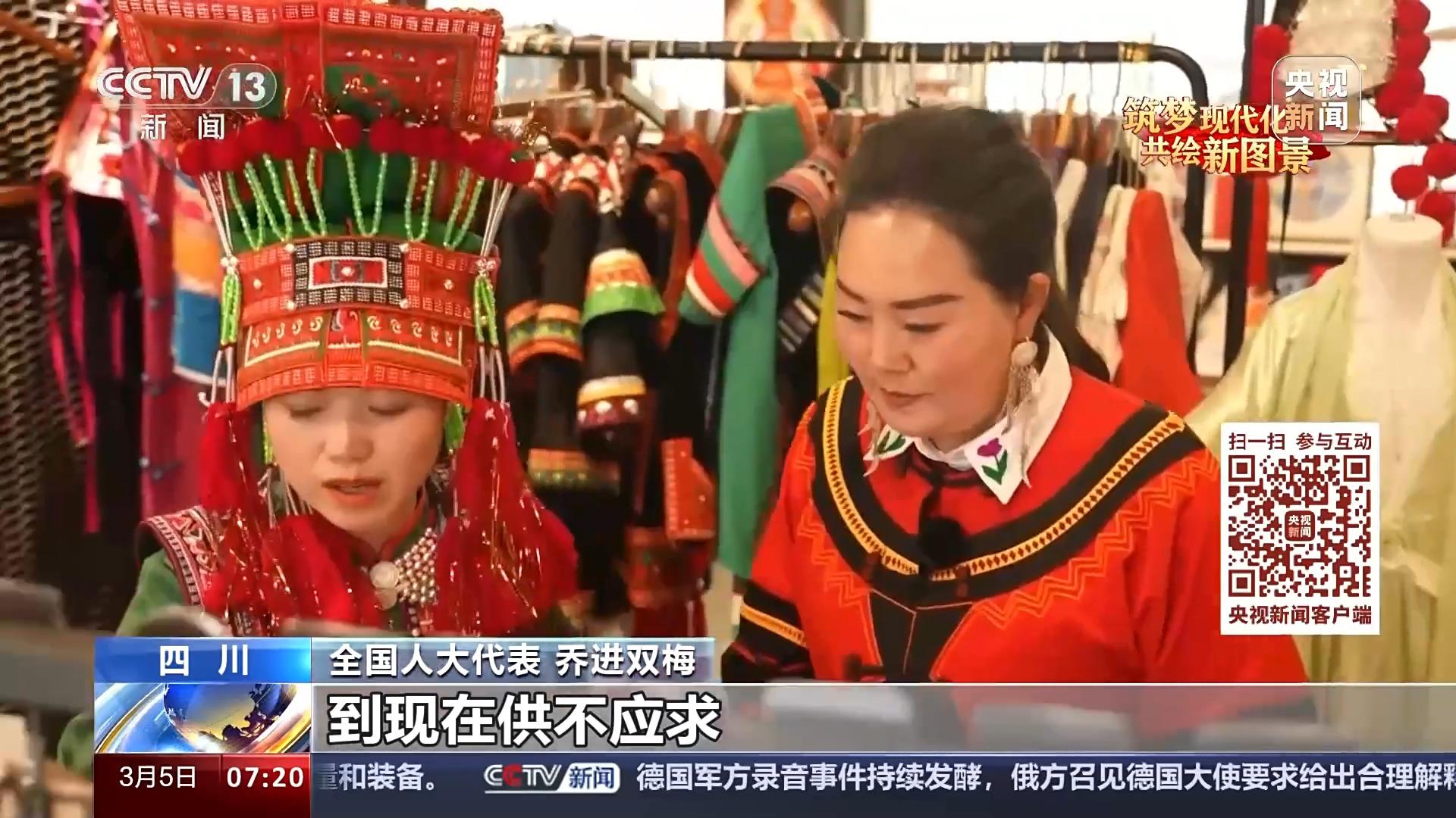 全国人大代表 乔进双梅:我们也是不断地在学习,我们到北京、云南、贵州到处去学习,学习以后,从无人问,这个彝绣没人要,到现在供不应求,我们很多产品都是逐步逐步都在做伴手礼,然后就是旅游产品。以前基本上都是传统的,它没有一些现代元素,而我们现在传统也不丢,也在研究新产品。