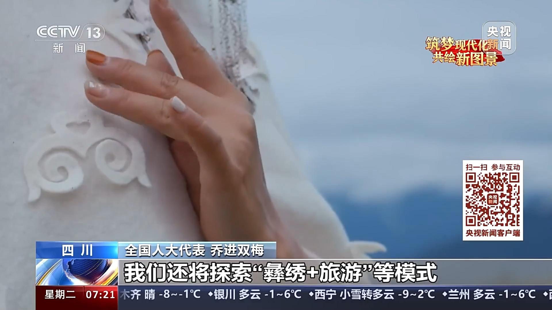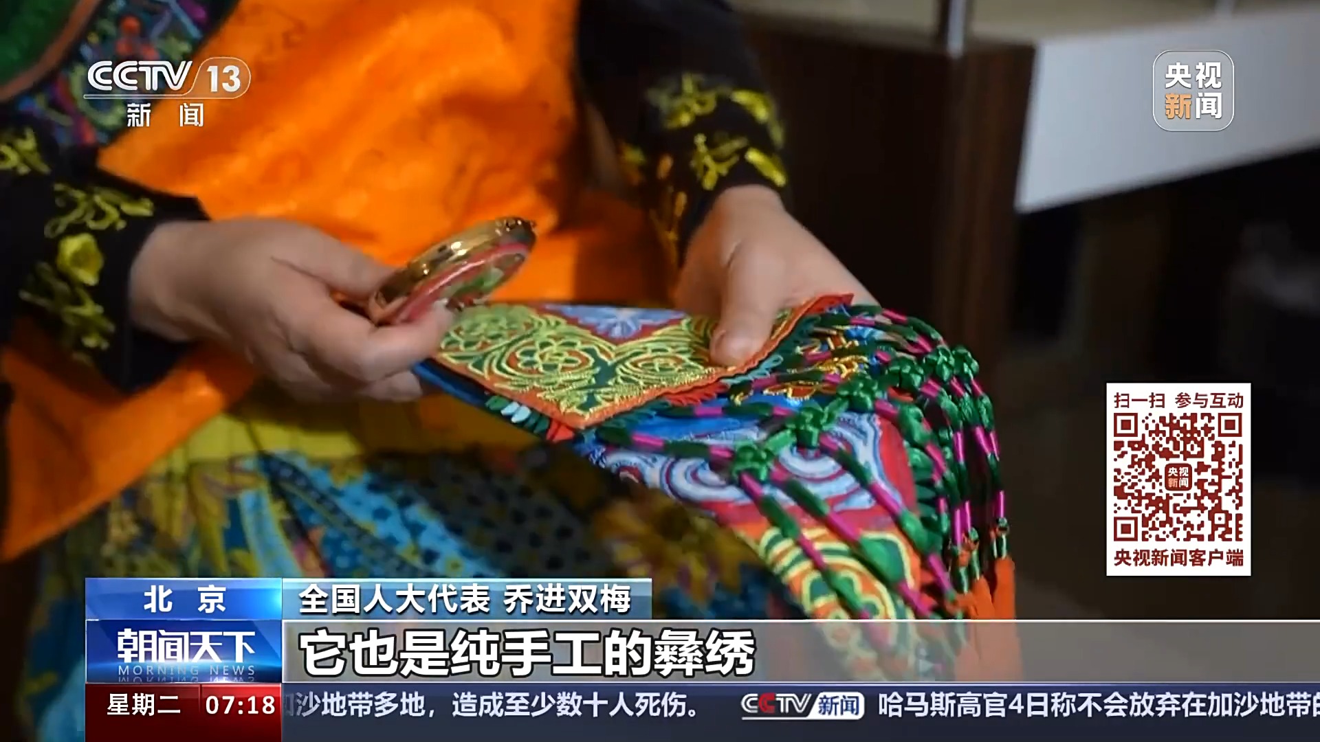 全国人大代表 乔进双梅:对。我想让更多的人了解彝绣、知道彝绣、欣赏彝绣,也通过这样的方式,来宣传民族特色文化。