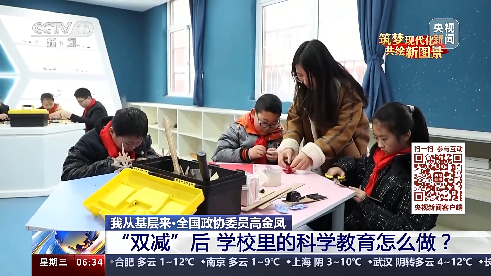 高金凤委员在调研中发现,虽然不少地方都面临专职科学教师的“缺口”,但一些兼职教师也用自己的方法,让科学教学活起来。在泰州市姜堰区这所乡镇小学,寒假期间,全校200多个孩子,每人都和家长录制了一个关于科学探究的实验视频,新学期开学第一课,便是由学生介绍这些科学实验。