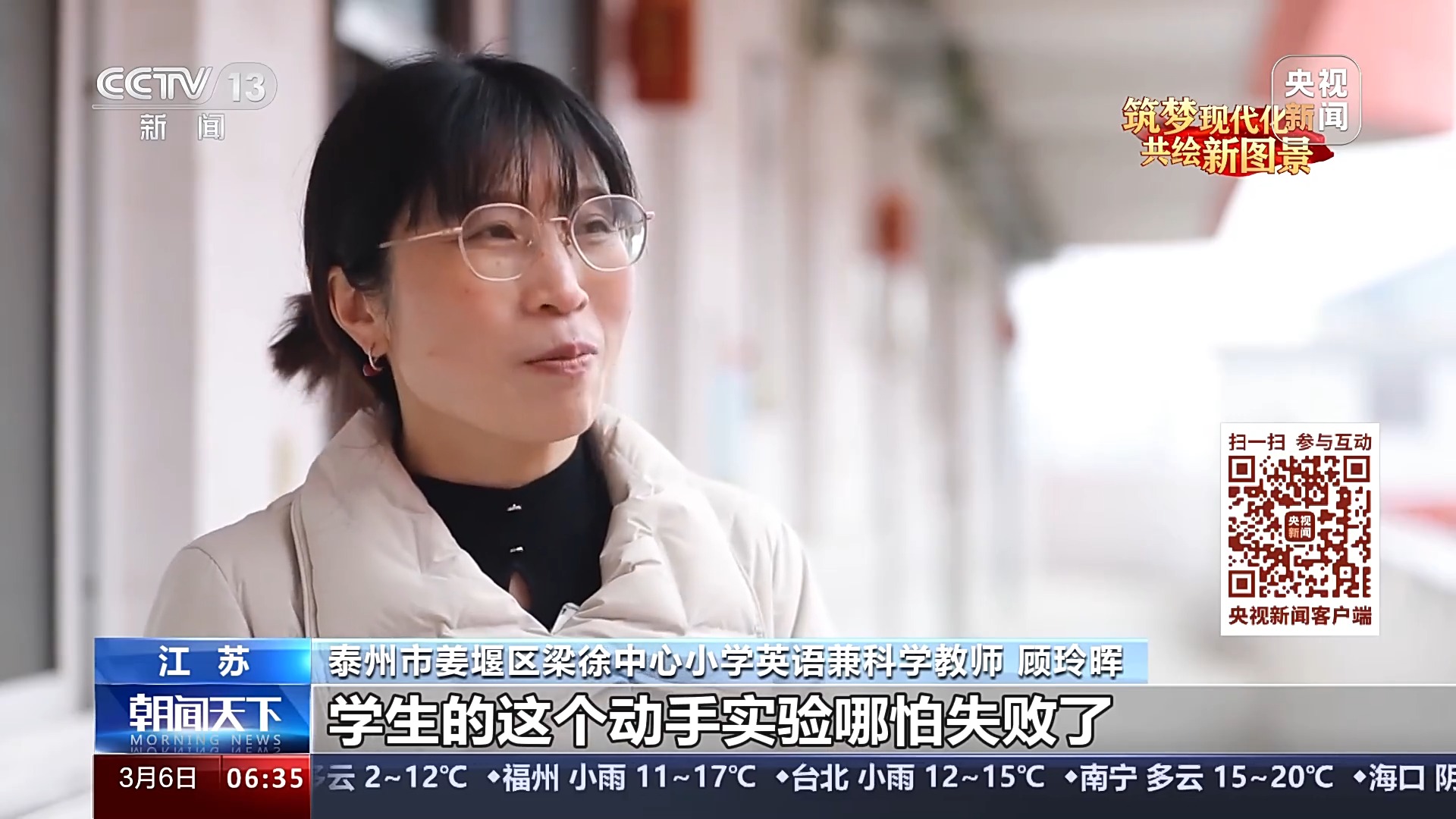 泰州市姜堰区梁徐中心小学英语兼科学教师 顾玲晖:我就觉得那个视频,他的这个动手实验哪怕失败了,我都觉得失败也是一种经验,也是一种成长,动起来、做起来,就不只停留在想象阶段。
