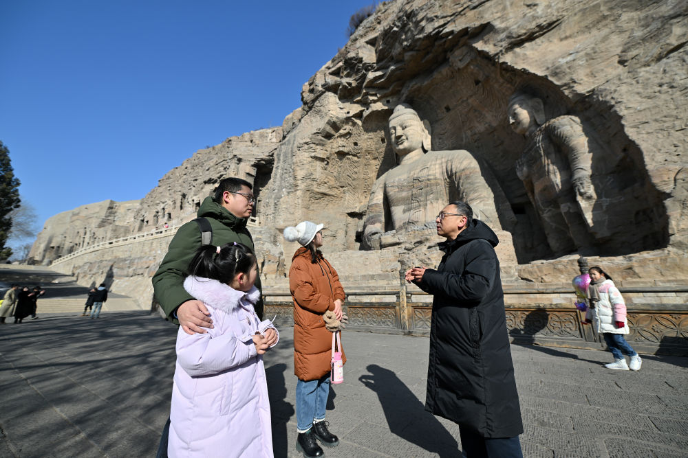2月25日,全国人大代表杭侃(右二)在云冈石窟调研走访,了解游客的需求。