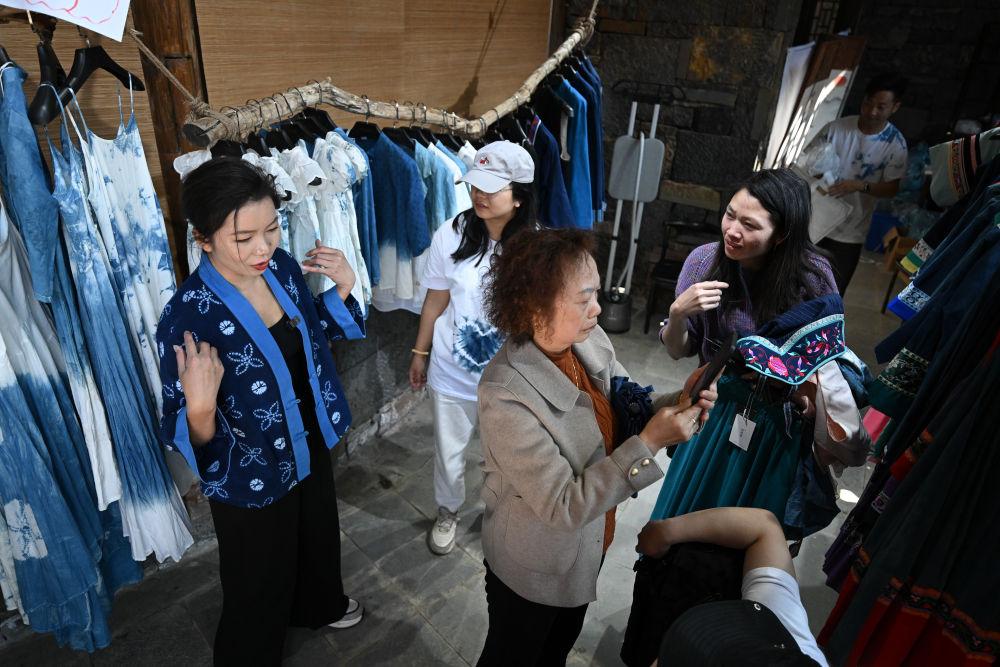 2月20日,全国人大代表李利(左一)在贵州省兴义市峰林布依景区门店内与顾客交流。