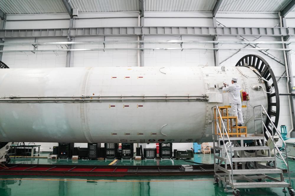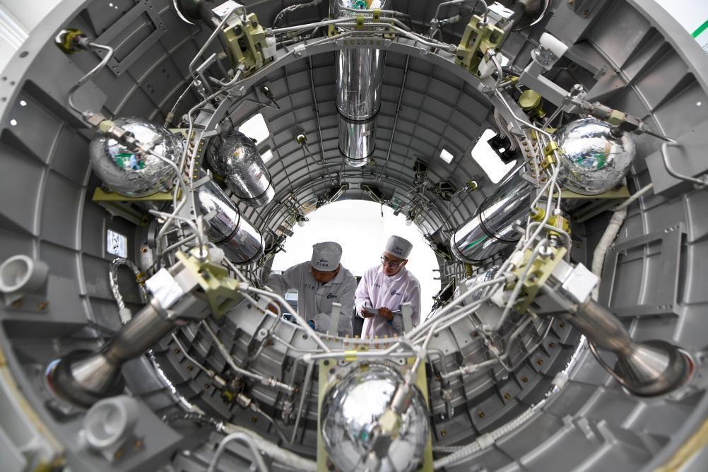 北京星际荣耀空间科技股份有限公司装配测试人员在安装液体姿轨控动力系统。