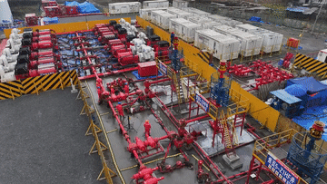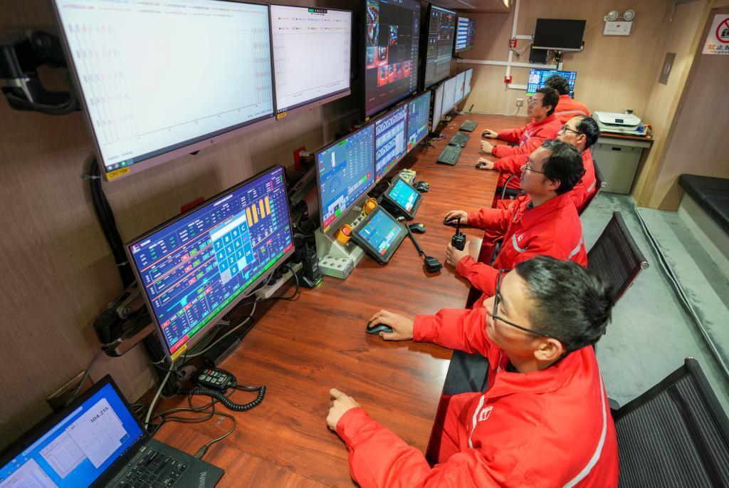 技术人员在重庆涪陵页岩气田焦页5号电驱压裂平台控制室作业。