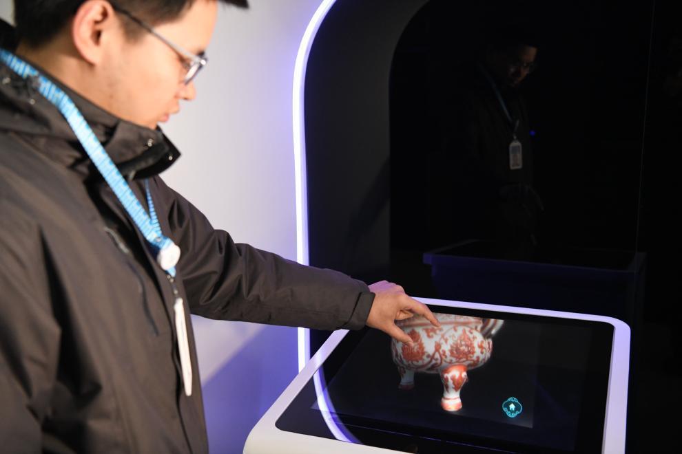 在安徽东超科技有限公司,工作人员演示空中成像互动查询台。