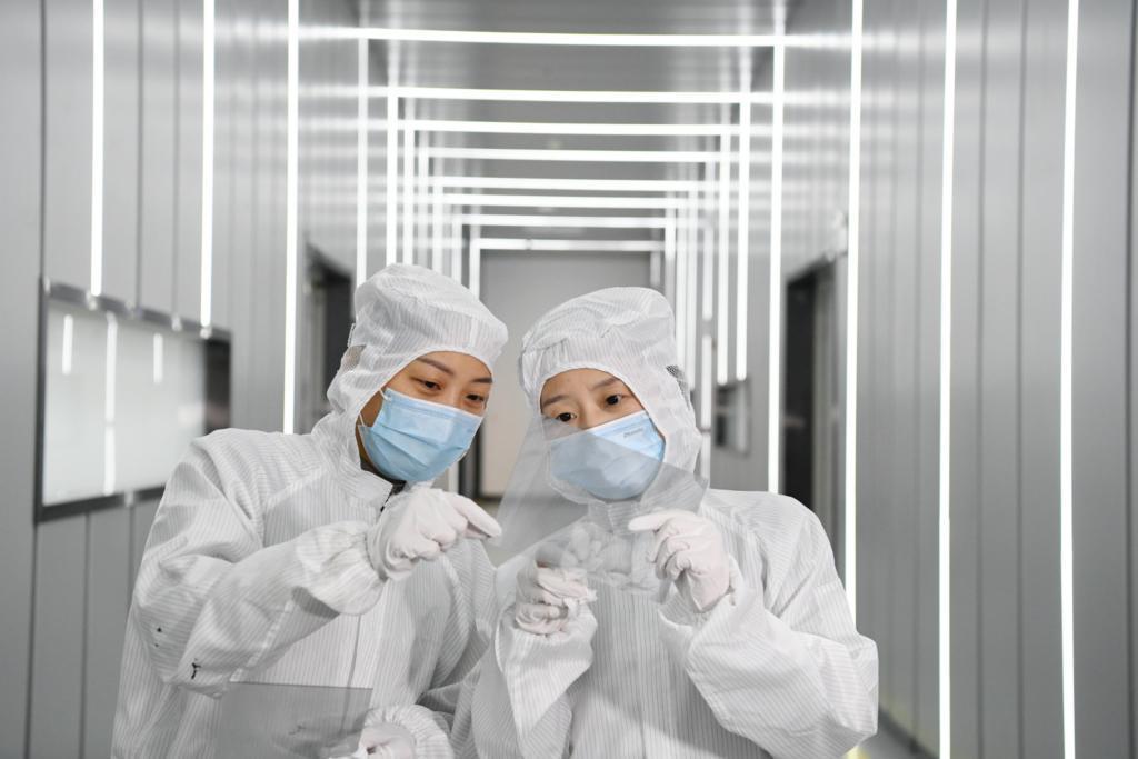 在东超科技工厂,技术人员检查负折射平板透镜原材料的品质。