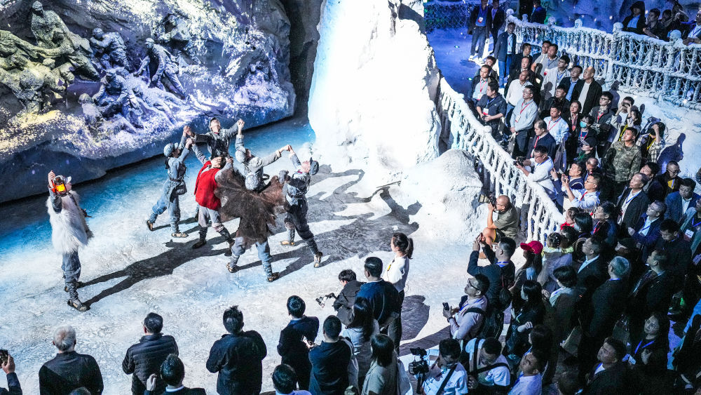 2023年10月22日,观众在位于贵阳市的“红飘带”数字体验馆内观看体验长征故事。以长征为主题的数字体验馆——“红飘带”项目利用全息影像、三维声场等新技术再现伟大长征。 新华社记者 陶亮 摄