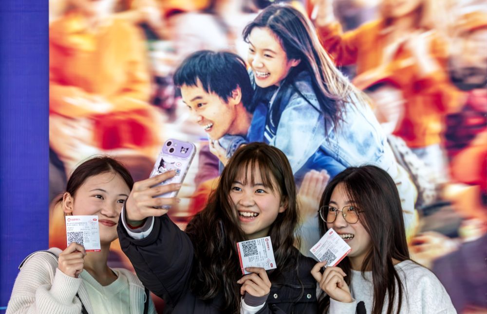 2024年2月18日,观众在贵州省黔西市横店电影城电影海报前留影。 新华社发(范晖 摄)