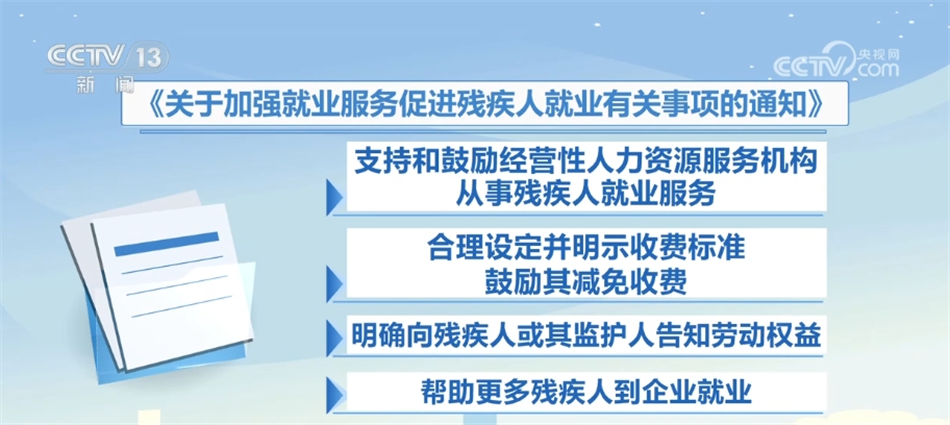 《通知》明确要求,加强残疾人就业服务和管理,严格落实按比例安排残疾人就业、缴纳残疾人就业保障金相关政策。支持和鼓励经营性人力资源服务机构从事残疾人就业服务,合理设定并明示收费标准,鼓励其减免收费,明确向残疾人或其监护人告知劳动权益,帮助更多残疾人到企业就业,对劳动合同、工资待遇发放、社会保险缴纳以及人员增减变更等实行信息化管理。