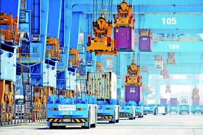 山东港口青岛港自动化码头装卸作业现场。新华社发