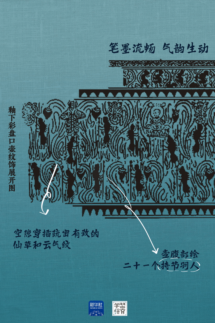 “这件藏于六朝博物馆的青瓷釉下彩羽人纹盘口壶于1983年出土,精湛的釉下彩绘工艺,改变了人们对釉下彩工艺始于唐代的认识,把我国釉下彩绘工艺出现的时间提前了近五百年。”宋燕说。