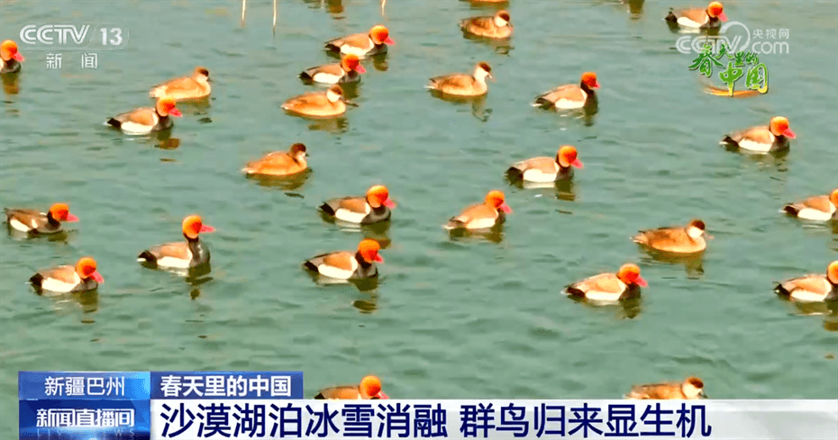 伴随着阵阵鸟鸣,我们来到新疆巴州尉犁县罗布淖尔国家湿地公园,碧绿的水面上,成群结队的赤嘴潜鸭、赤麻鸭等鸟类时而用翅膀拍打水面展翅飞翔,时而三五成群在水中嬉戏、觅食,群鸟与黄沙、碧水、苇丛、胡杨交相辉映,形成一幅生机勃勃的春日画卷。