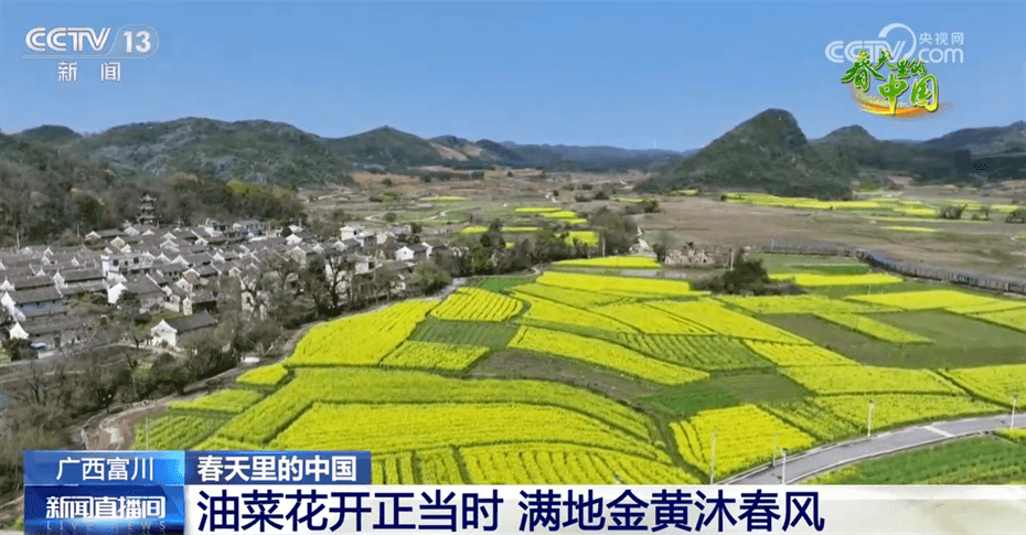 现在我们看到的是广西富川瑶族自治县的四万多亩油菜。眼下,春意正浓,油菜进入盛花期,明艳的金黄色成了春日主色调。油菜花次第开放,清风微拂,淡淡花香沁人心脾,花海与山峦、古村勾勒出一幅田园春景图,吸引不少游客前来赏花踏青,感受春天的气息。