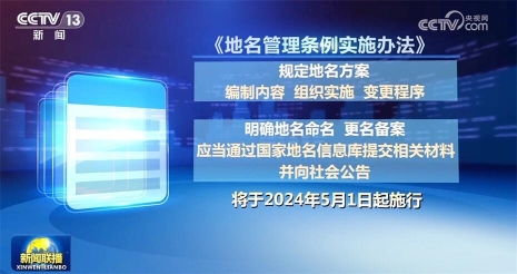 由民政部制定的《地名管理条例实施办法》(以下简称《办法》)日前公布,该《办法》规定了地名方案的编制内容、组织实施和变更程序,明确地名命名、更名备案应当通过国家地名信息库提交相关材料并向社会公告,《办法》将于2024年5月1日起施行。