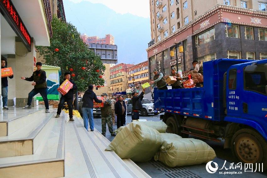 雅江县的志愿者们有序搬运物资。人民网记者朱虹摄