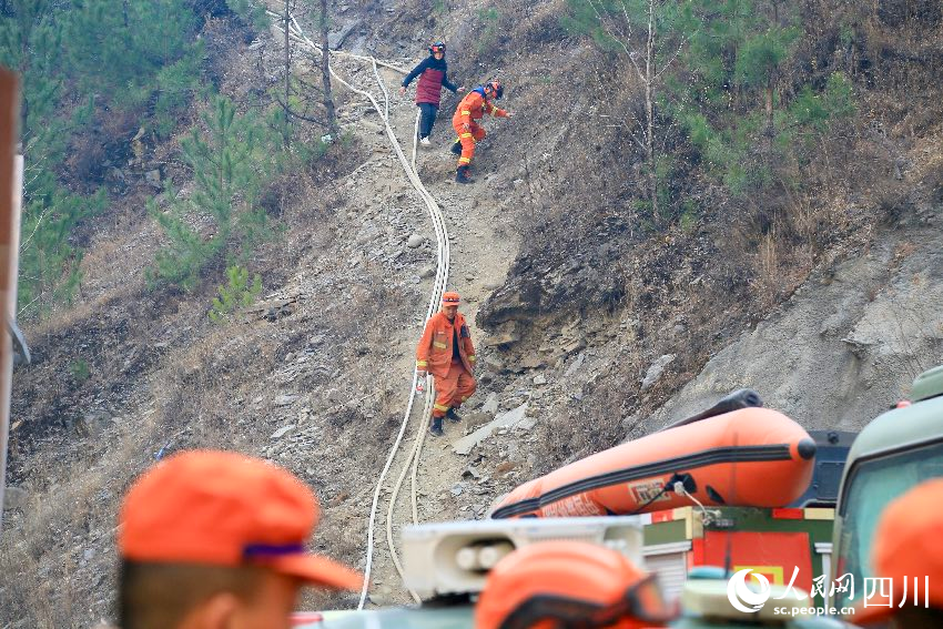 甘孜州森林消防支队雅江大队大队长张国胜从山上走下(前排)。人民网记者 朱虹摄