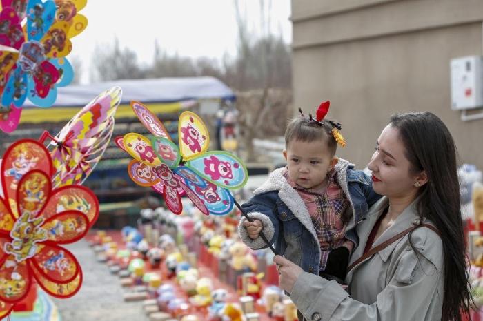 3月20日,游客在2024年吐鲁番杏花季集市上购买玩具。新华社记者 陈朔 摄
