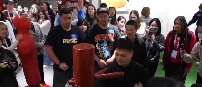 在首都体育学院,武术表演、梅花桩、咏春拳木人桩、功夫扇、舞龙、舞狮,中国学生们的精彩展示,吸引大家连连喝彩、争相体验。