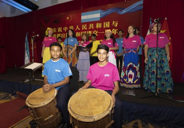 3月22日,演员在特古西加尔巴举行的庆祝中洪建交一周年招待会上表演节目。