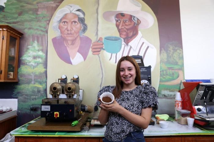 3月23日,在盖坦咖啡坊,工作人员展示咖啡。