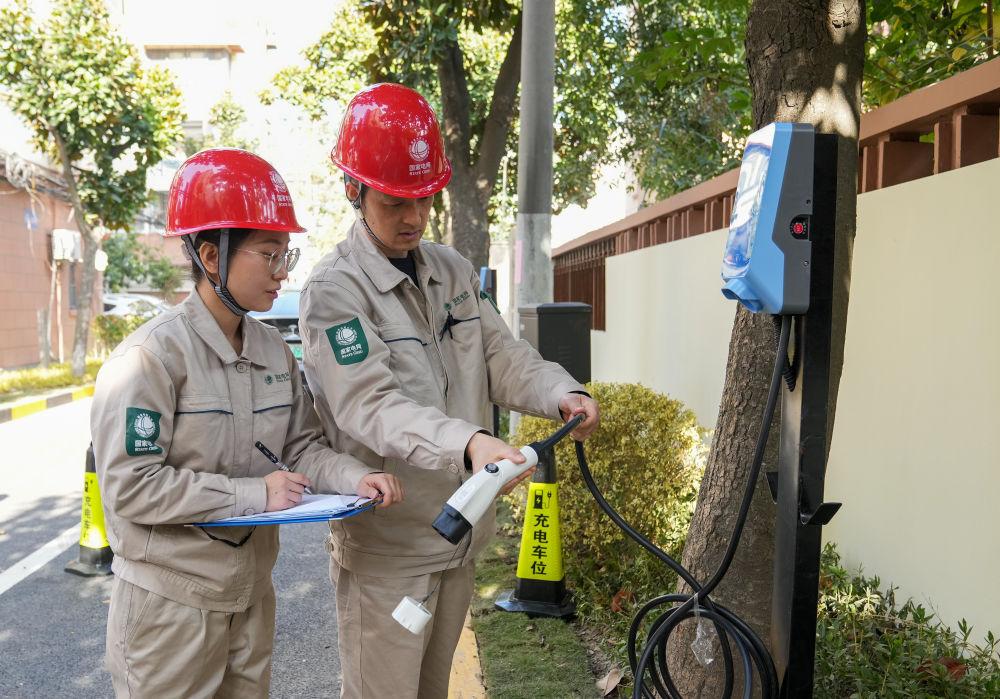 2023年11月29日,在上海市徐汇区田林十三村小区内,国网上海市南供电公司的工作人员在检查充电桩运行情况。新华社记者 丁汀 摄