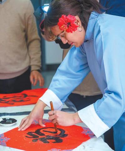 安雅在学校为留学生举办的新春活动上用毛笔书写“福”字。受访者供图