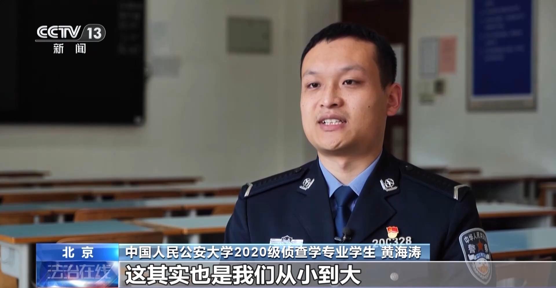 中国人民公安大学2020级侦查学专业学生 黄海涛:小时候自己总觉得跟别人没有差距。后来记得有一次初中的时候,然后有一个同学的爸爸进校园给他送东西,然后又看到他开心地跑过去还抱一块,然后当时会觉得原来是这个样子,然后才会开始觉得有些事情确实是没办法再弥补的,哪怕以后再有什么也很难去弥补当时的那种缺失,然后就会觉得会很难受。