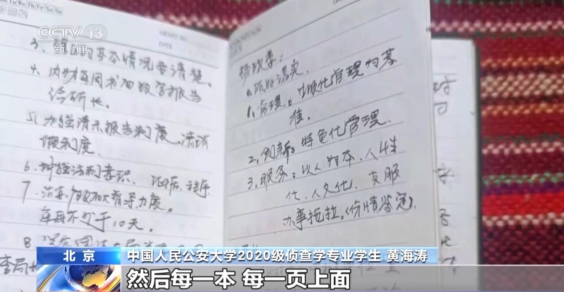 中国人民公安大学2020级侦查学专业学生 黄海涛:大概就这么一个小本,他大概记了有五六本,然后每一本、每一页上面都记了他今天做了一些什么事情,办了一些什么案子,还有一些什么案子没有结,就密密麻麻很详细。当时看到他的那些日记本其实挺受触动的,就觉得他真的很热爱这份工作,很热爱这份职业。