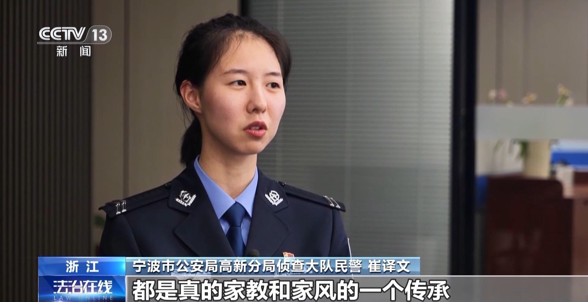 浙江省宁波市公安局高新分局侦查大队民警 崔译文:我一开始会觉得会不会他们想去从事更多自己喜欢的事情,而不是从事警察。但是我过去以后发现,其实我们很多的人都是真的家教和家风的一个传承,也是刷新了一下我的一些疑问。