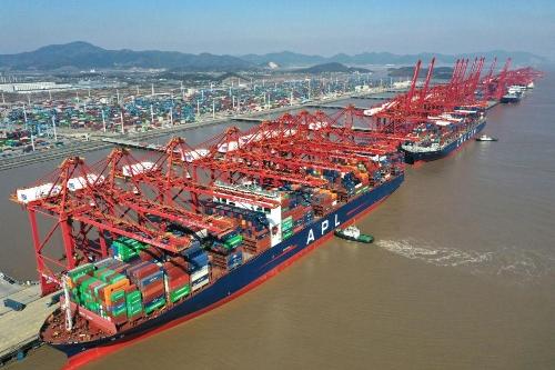在东海之滨的宁波舟山港穿山港区,来自远洋的万吨巨轮正在靠泊,堆场上叠满了世界各地发来的集装箱。2023年,宁波舟山港完成货物吞吐量超13.24亿吨,同比增长4.9%。
