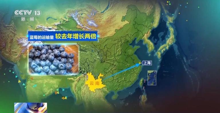 在时令水果中,蓝莓的运输量较去年增长最多,达到两倍。而运出蓝莓最多的省份是云南,它们被送到上海、山东、浙江、广东、河北、四川等全国各地。