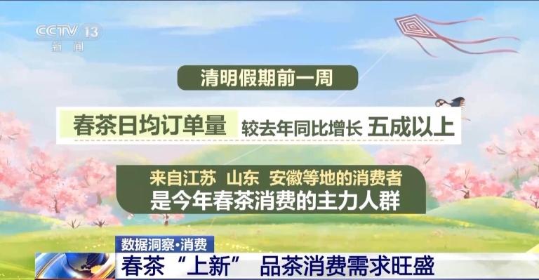 一两春茶一两金,正是品茗好时节,随着清明时节到来,新产的春茶受到不少茶友青睐。截至清明假期前一天,短视频平台上“春茶季”相关话题的视频播放量达到七亿次。抖音电商数据显示,清明假期前一周,春茶日均订单量较去年同比增长五成以上。其中,来自江苏、山东、安徽等地的消费者是今年春茶消费的主力人群。
