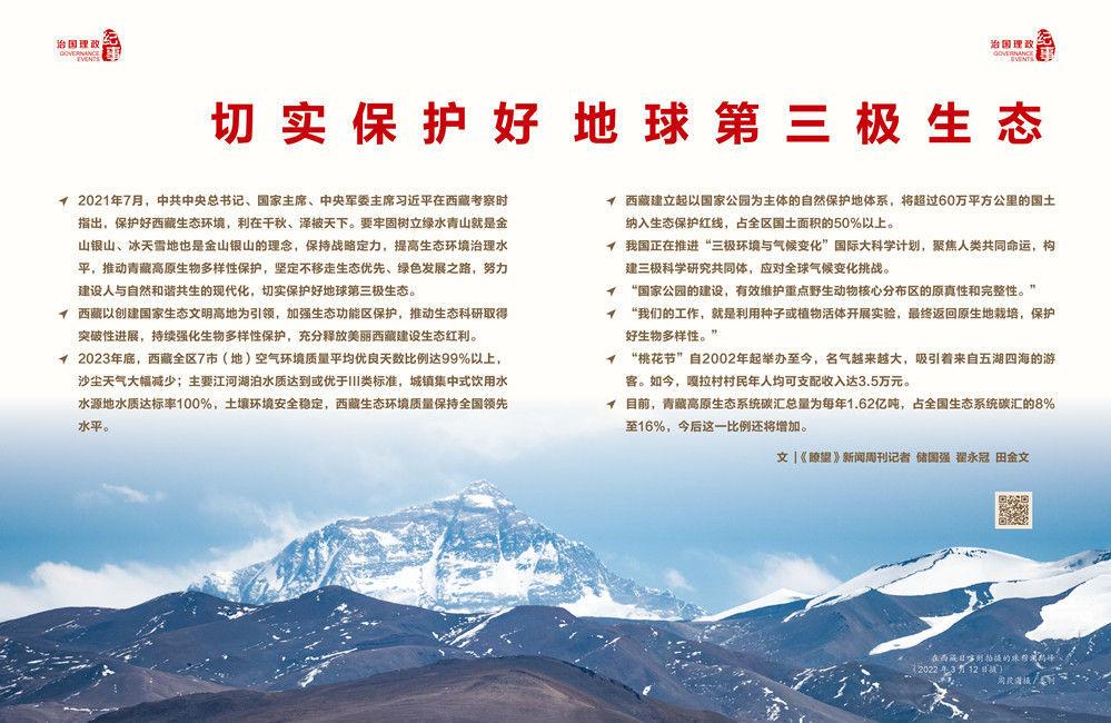 ◇2021年7月,中共中央总书记、国家主席、中央军委主席习近平在西藏考察时指出,保护好西藏生态环境,利在千秋、泽被天下。要牢固树立绿水青山就是金山银山、冰天雪地也是金山银山的理念,保持战略定力,提高生态环境治理水平,推动青藏高原生物多样性保护,坚定不移走生态优先、绿色发展之路,努力建设人与自然和谐共生的现代化,切实保护好地球第三极生态。