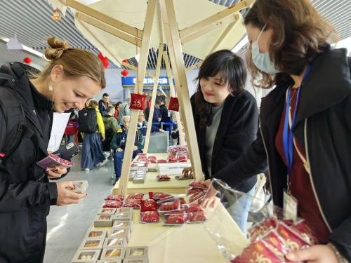 入境游客在设立在上海吴淞口国际邮轮港的摊位前驻足,了解“一袋上海”文创礼品等伴手礼。新华社记者 陈爱平 摄