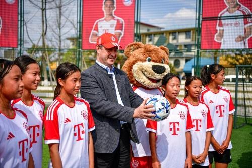 德国巴伐利亚州州长索德尔(左四)在位于成都市武侯区的阿迪达斯20号体育公园观摩了一场中国少年女子足球队的训练赛。新华社记者张超群摄