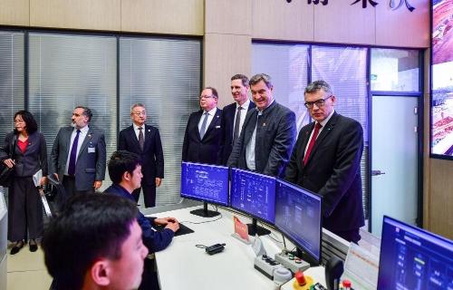 德国巴伐利亚州州长索德尔(右二)一行来到中德合作的磁悬浮成都试验线列车运控中心参观。新华社记者张超群摄