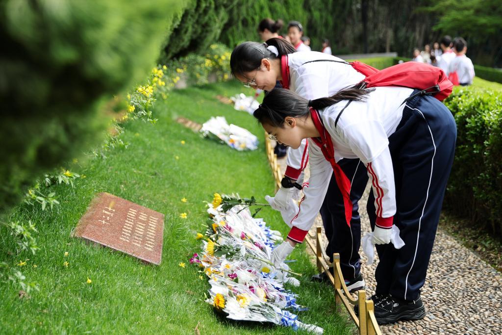 4月4日,少先队员在上海龙华烈士陵园烈士墓碑区域献花。新华社记者 王翔 摄
