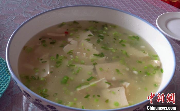 高泉的清炖豆腐,洁白中嵌入几点葱花,隐隐约约透出青绿,清香飘逸,圆顺滑口,令人难以忘怀。唐永建 摄