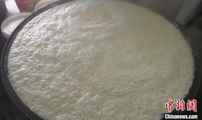走进豆腐坊,在嗡嗡作响的机器声中,一粒粒圆滚滚的黄豆在机器中翻滚着,进料口连接着高泉本地的泉水。机器转动着,奶白色的豆浆缓缓从电动石磨上流了出来,汇聚到一口超大的铁锅中。