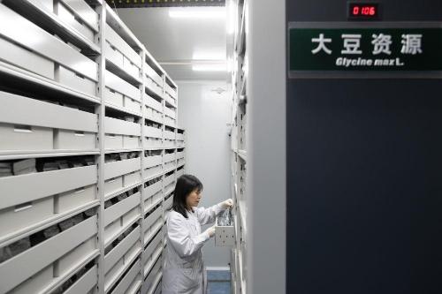 2024年4月2日,工作人员在国家寒带作物及大豆种质资源中期库(哈尔滨)内查看大豆种质情况。新华社记者 张涛 摄