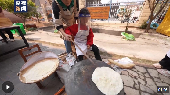 烙馍,当地的一种传统面食。烙烙馍对成年人来说也是个技术活,怎么摊、怎么翻、怎么挑,都有窍门儿。好在有老师从旁指导,孩子们熟能生巧、慢慢都能上手。