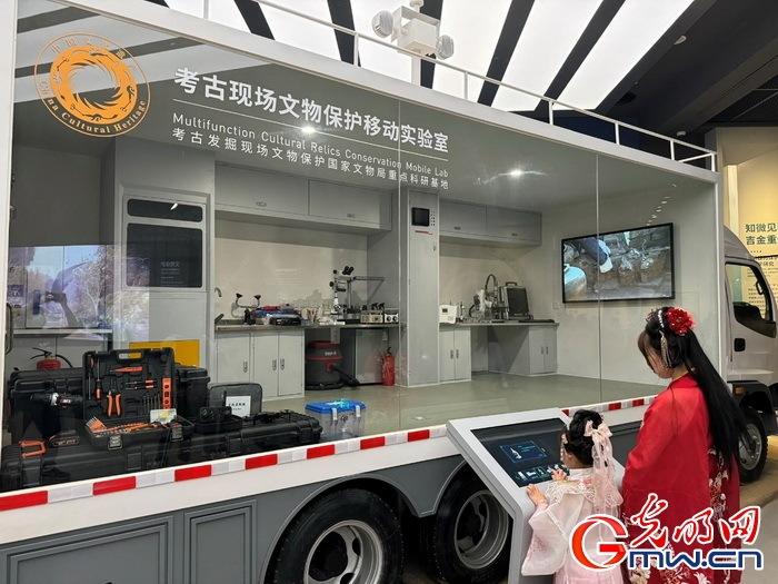 2024年4月13日,游客在陕西考古博物馆了解“考古现场文物保护移动实验室”。(光明网记者 孔繁鑫摄/光明图片)