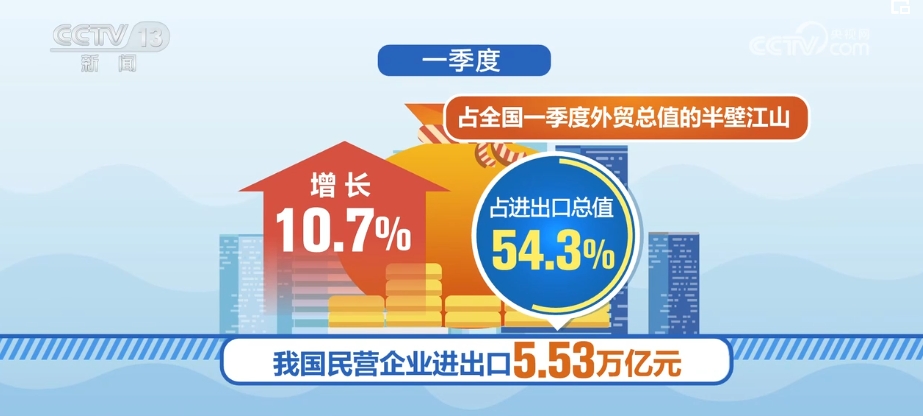 央视网消息:海关总署近日公布,2024年一季度,我国进出口规模历史同期首次突破10万亿元,进出口增速创6个季度以来新高。其中,民营企业进出口保持两位数增长,成绩亮眼。一季度,我国民营企业进出口5.53万亿元,增长10.7%,占进出口总值的54.3%,占全国一季度外贸总值的半壁江山。