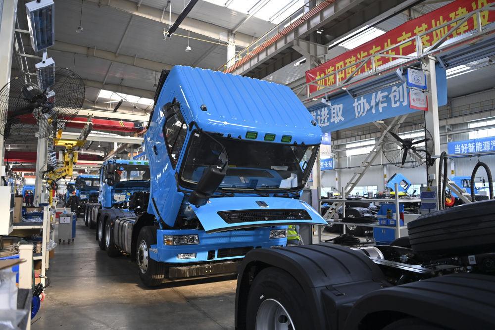 工作人员在位于山西省晋中市榆次区的山西新能源汽车工业有限公司(吉利晋中基地)生产甲醇重卡(4月1日摄)。新华社记者 杨晨光 摄