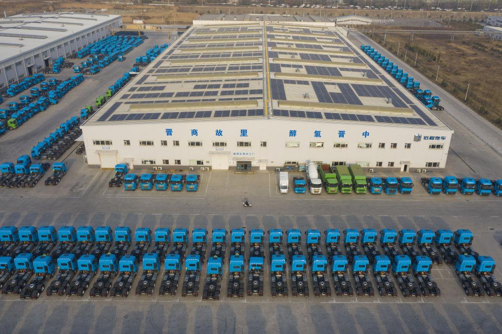 这是在位于山西省晋中市榆次区的山西新能源汽车工业有限公司(吉利晋中基地)拍摄的甲醇重卡(4月1日摄,无人机照片)。新华社记者 杨晨光 摄