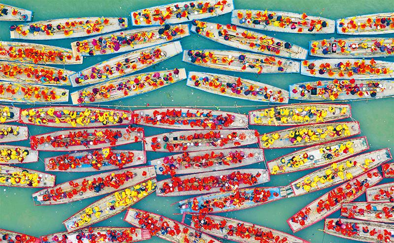 溱潼会船由南宋相沿至今,历经数百年传承,被列入国家级非物质文化遗产名录。图为2024年4月6日在江苏省泰州市姜堰区溱湖国家湿地公园参加会船表演的船只。 新华社发 汤德宏/摄