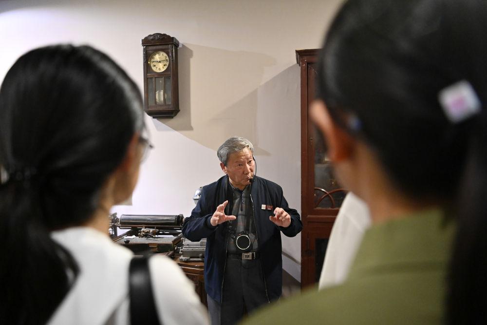 金彭育(左一)在五大道历史博物馆义务给游客讲解(4月13日摄)。