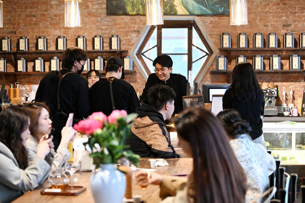 在天津市和平区五大道,一家新开业的茶饮店内顾客络绎不绝(4月10日摄)。