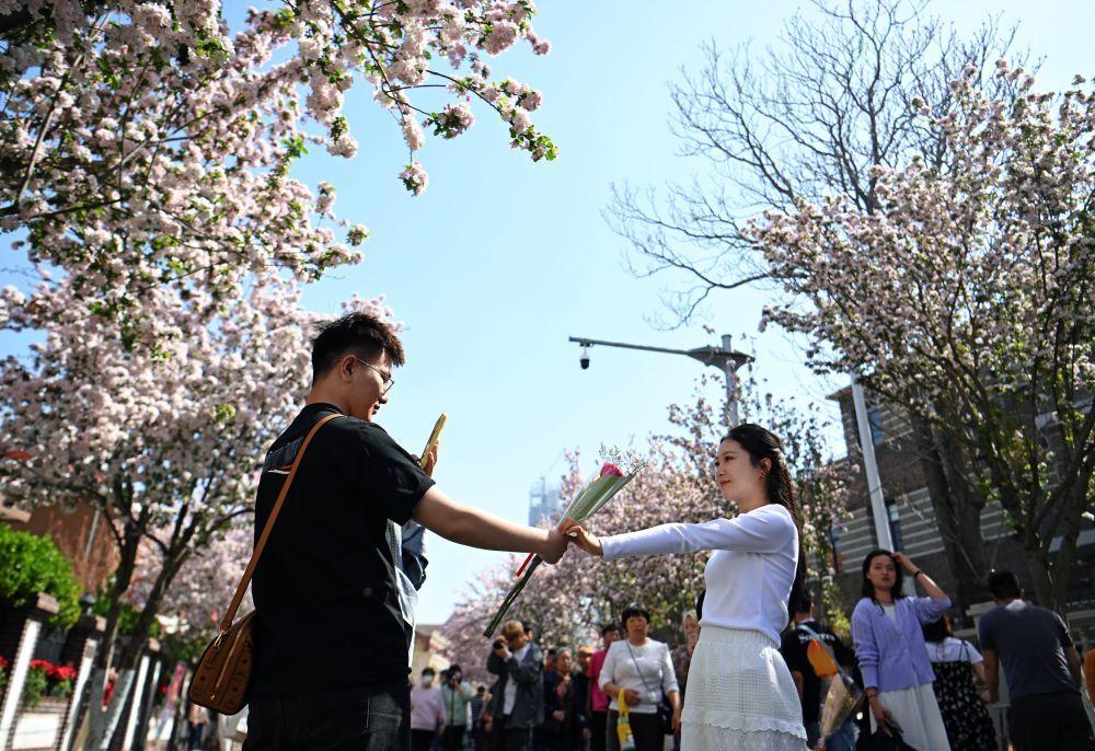市民在海棠花盛开的五大道大理道上拍照打卡(4月7日摄)。